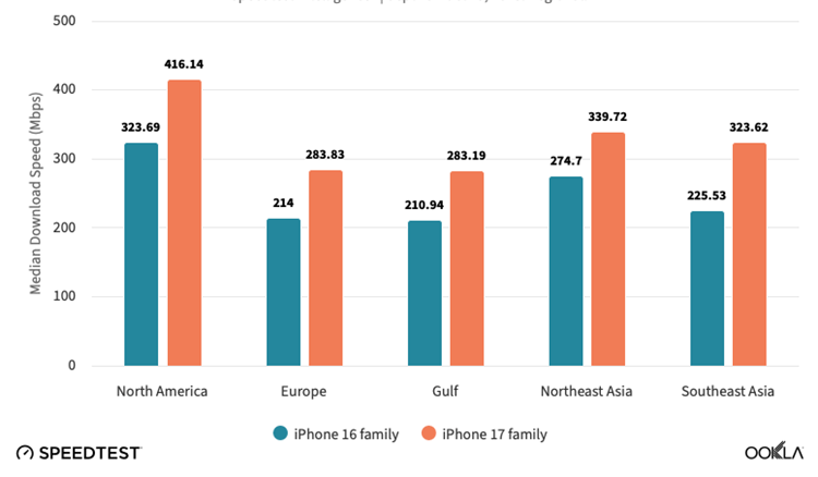 北美地区:iPhone 17系列平均下载速度为416Mbps,iPhone 16系列为323Mbps。