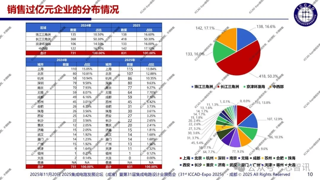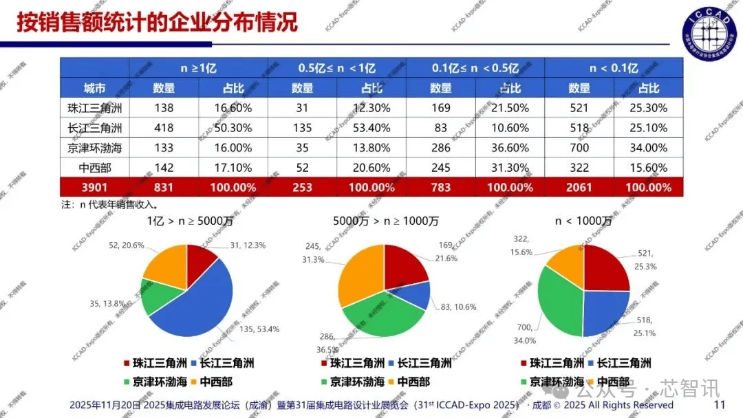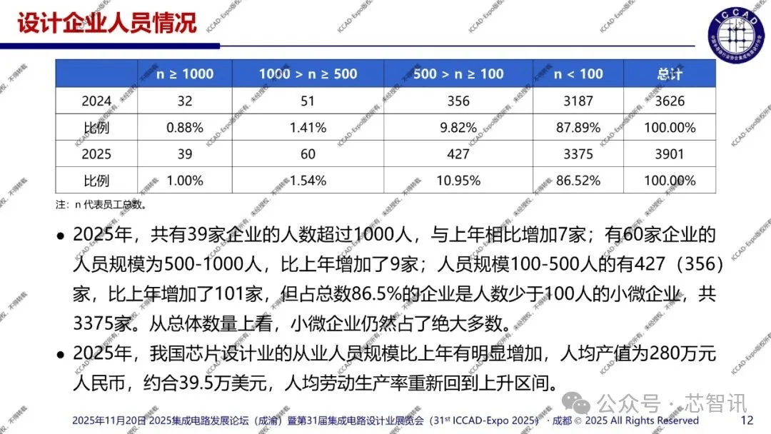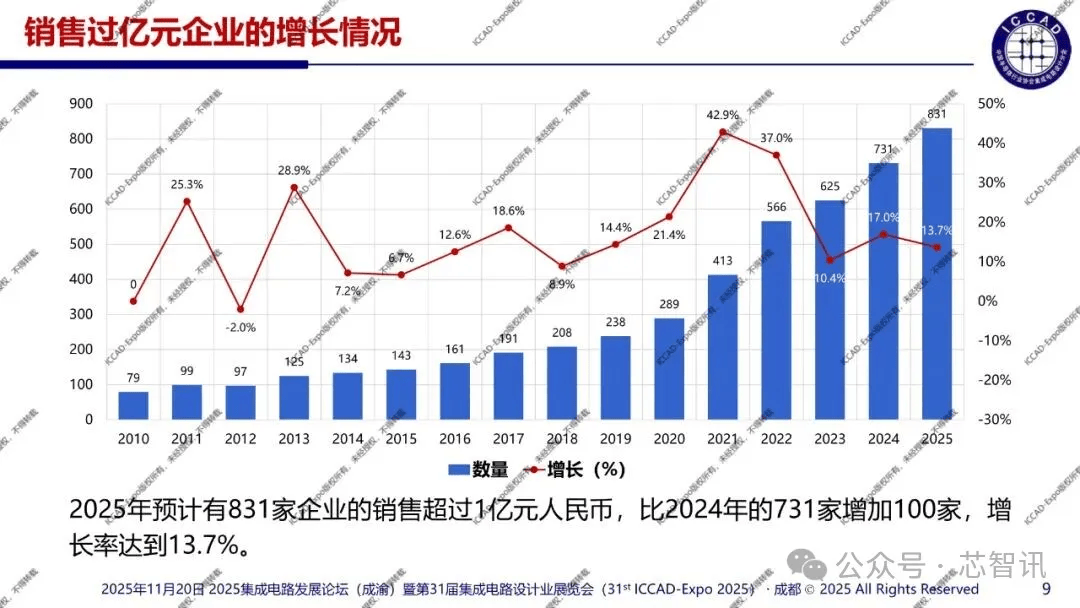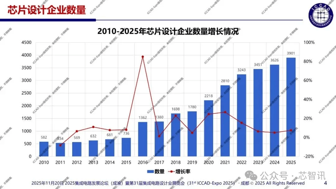 根据魏少军教授公布的数据显示,2025年中国芯片设计公司达到3901家。从销售规模来看,全行业销售预计为8357.3亿元,相比2024年增长29.4%。按照美元与人民币1:7.08的平均兑换率,全年销售额约为1180.4亿美元,占全球集成电路产品市场的比例与上年相比会有一定上升。