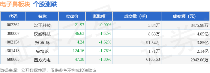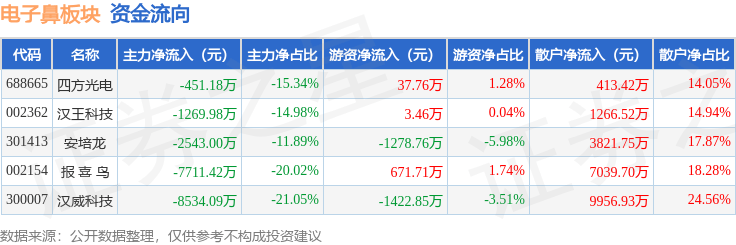 从资金流向上来看,当日电子鼻板块主力资金净流出2.05亿元,游资资金净流出1988.67万元,散户资金净流入2.25亿元。电子鼻板块个股资金流向见下表: