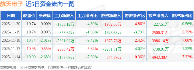证券之星消息,截至2025年11月20日收盘,航天电子(600879)报收于10.74元,上涨0.0%,换手率1.15%,成交量37.85万手,成交额4.08亿元。