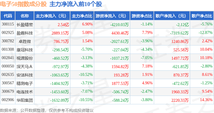 资金流向方面,电子50(399281)指数成份股当日主力资金净流出合计73.34亿元,游资资金净流入合计15.79亿元,散户资金净流入合计57.54亿元。成份股资金流向详情见下表: