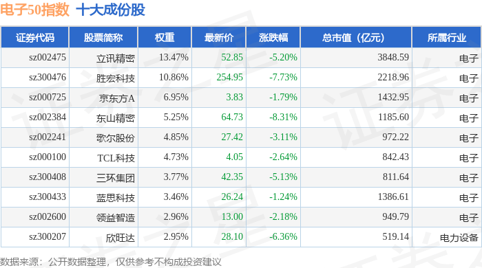 电子50(399281)指数十大成份股详情如下: