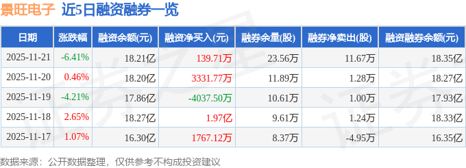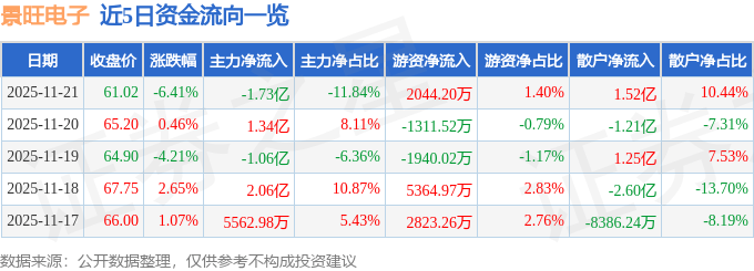 证券之星消息,截至2025年11月21日收盘,景旺电子(603228)报收于61.02元,下跌6.41%,换手率2.41%,成交量23.52万手,成交额14.57亿元。