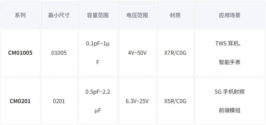 - 推荐系列:CM0201/CM0402HF(0201~0402封装,C0G材质)