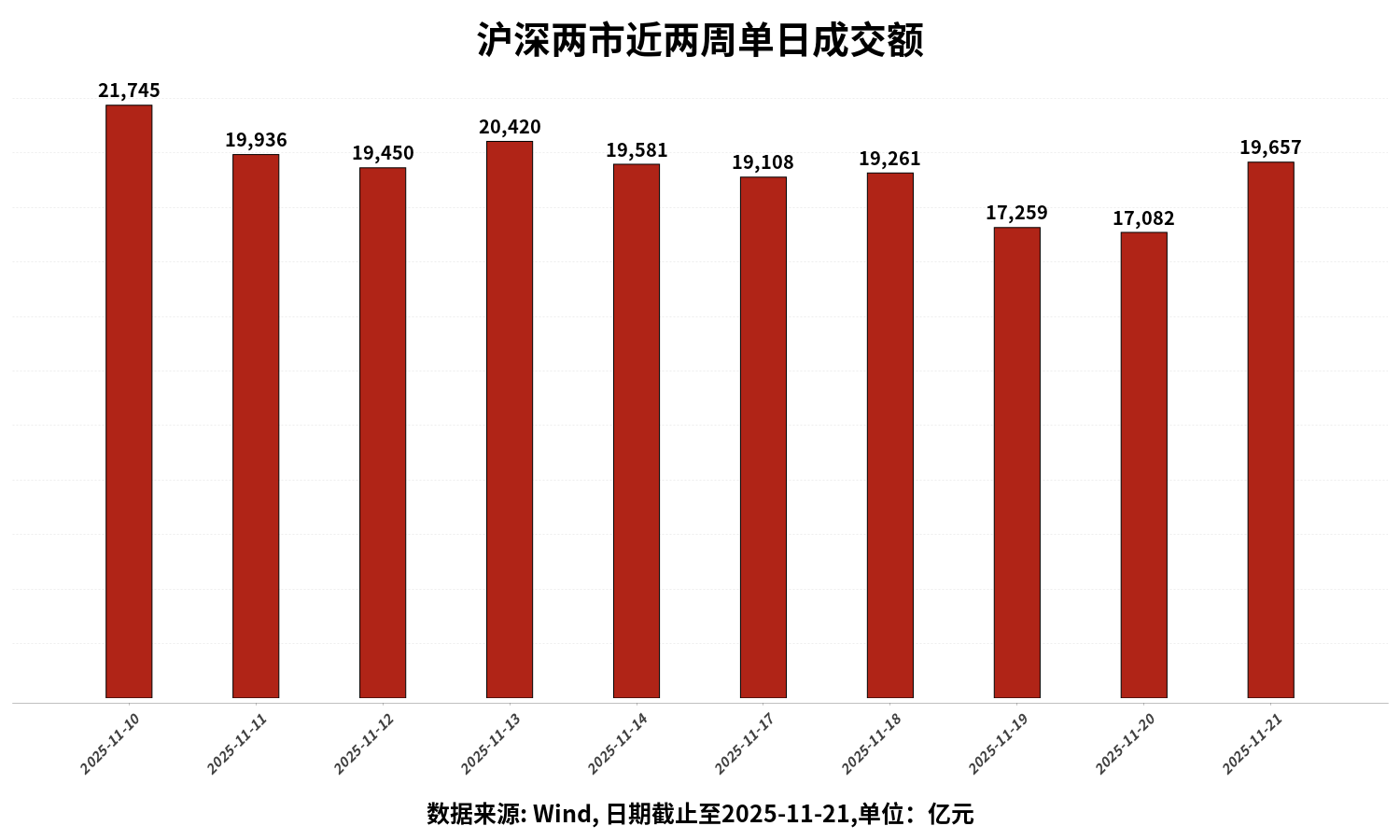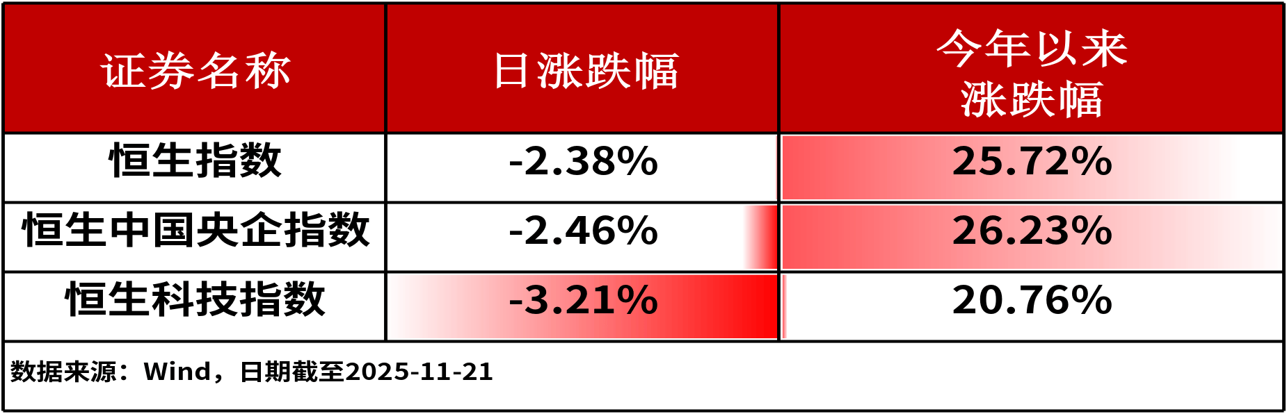 11月21日,A股三大股指全线下跌超2%,市场整体承压。其中,上证指数下跌2.45%,深证成指下跌3.41%,创业板指下跌4.02%,显示市场情绪较为低迷。主流宽基指数中,北证50指数下跌4.71%,跌幅相对较大。全市场仅354只股票上涨。港股三大股指集体收跌,其中恒生科技指数下跌3.21%,跌幅相对居前,市场情绪受外围波动影响表现疲弱。沪深两市成交额为19657亿元人民币,相较上个交易日大幅增量,增量达2575亿。