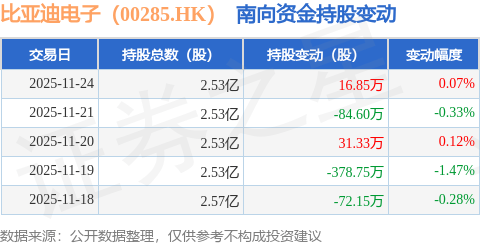 证券之星消息,11月24日南向资金增持16.85万股比亚迪电子(00285.HK)。近5个交易日中,获南向资金减持的有3天,累计净减持487.32万股。近20个交易日中,获南向资金减持的有13天,累计净减持1931.46万股。截至目前,南向资金持有比亚迪电子(00285.HK)2.53亿股,占公司已发行普通股的11.21%。
