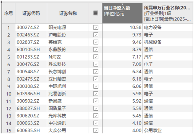 Choice数据显示,11月25日,当日资金净流入额排名居前个股包括阳光电源、沪电股份、英维克、永鼎股份、胜宏科技等,净流入额均超7亿元。其中,沪电股份、永鼎股份、胜宏科技等属于电子或通信板块。