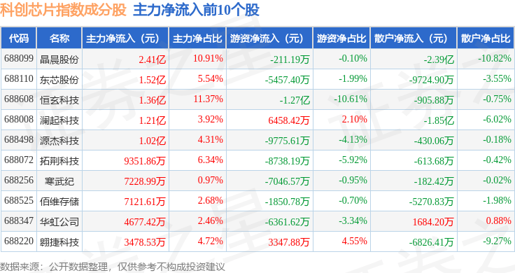 资金流向方面,科创芯片(000685)指数成份股当日主力资金净流入合计5.08亿元,游资资金净流入合计1045.72万元,散户资金净流出合计5.19亿元。成份股资金流向详情见下表: