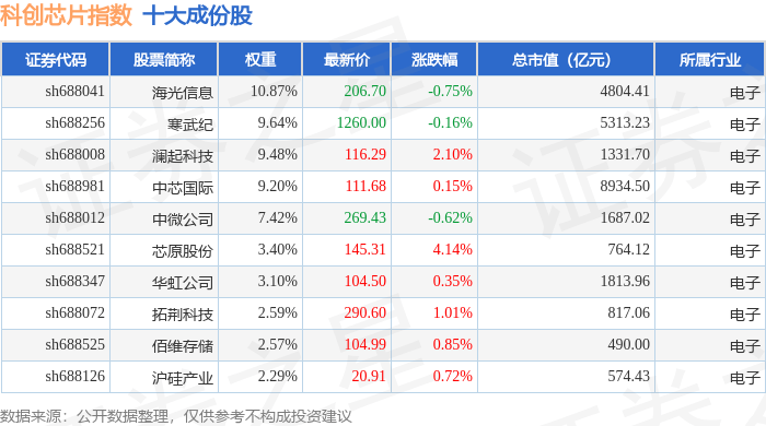 科创芯片(000685)指数十大成份股详情如下: