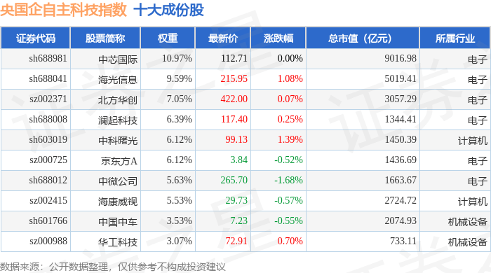 证券之星消息,11月27日,央国企自主科技(980083)指数报收于1712.66点,跌0.23%,成交560.04亿元,换手率0.93%。当日该指数成份股中,上涨的有17家,中新赛克以1.44%的涨幅领涨,下跌的有32家,深南电路以3.41%的跌幅领跌。