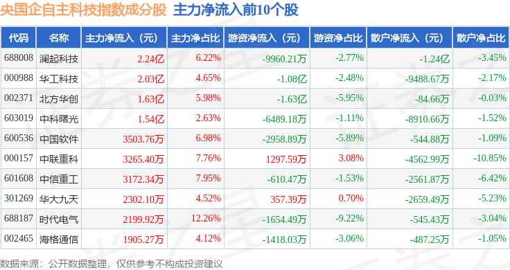 资金流向方面,央国企自主科技(980083)指数成份股当日主力资金净流出合计2.09亿元,游资资金净流入合计7128.07万元,散户资金净流入合计1.38亿元。成份股资金流向详情见下表:
