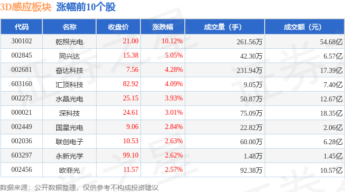 证券之星消息,12月1日3D感应板块较上一交易日上涨2.5%,乾照光电领涨。当日上证指数报收于3914.01,上涨0.65%。深证成指报收于13146.72,上涨1.25%。3D感应板块个股涨跌见下表: