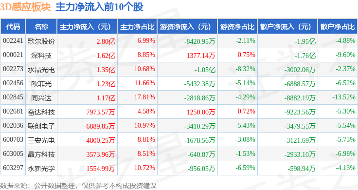 从资金流向上来看,当日3D感应板块主力资金净流入4.16亿元,游资资金净流出1.24亿元,散户资金净流出2.92亿元。3D感应板块个股资金流向见下表: