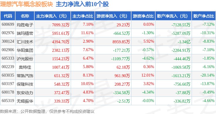 从资金流向上来看,当日理想汽车概念股板块主力资金净流出2.22亿元,游资资金净流入8495.54万元,散户资金净流入1.37亿元。理想汽车概念股板块个股资金流向见下表: