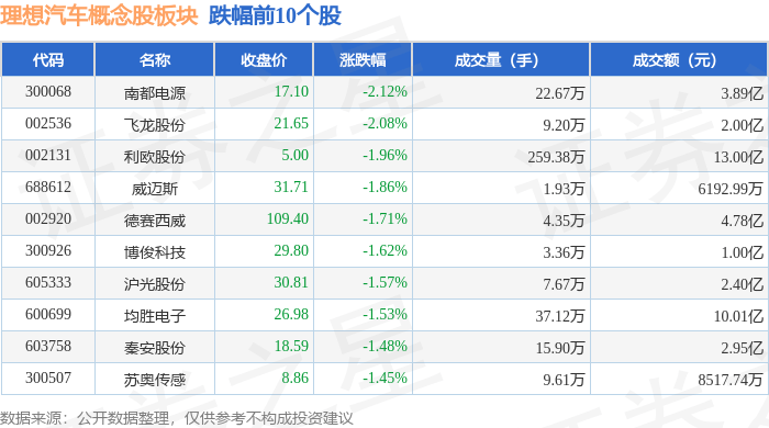 证券之星消息,12月2日理想汽车概念股板块较上一交易日下跌0.96%,南都电源领跌。当日上证指数报收于3897.71,下跌0.42%。深证成指报收于13056.7,下跌0.68%。理想汽车概念股板块个股涨跌见下表: