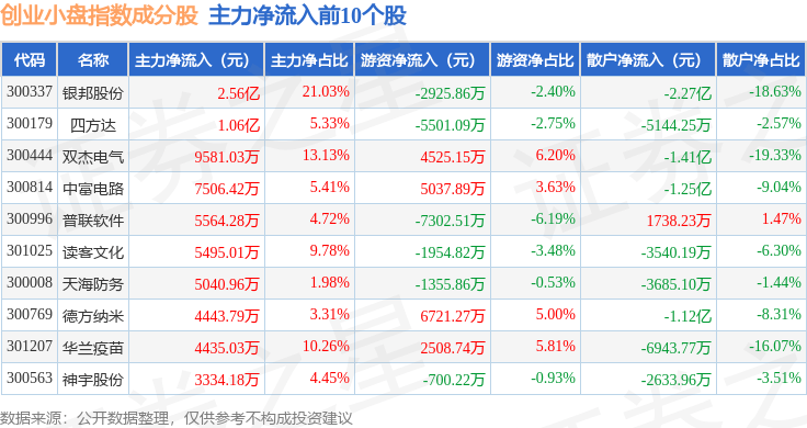资金流向方面,创业小盘(399020)指数成份股当日主力资金净流出合计30.39亿元,游资资金净流入合计6.63亿元,散户资金净流入合计23.76亿元。成份股资金流向详情见下表: