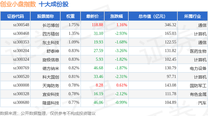 创业小盘(399020)指数十大成份股详情如下: