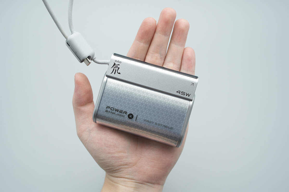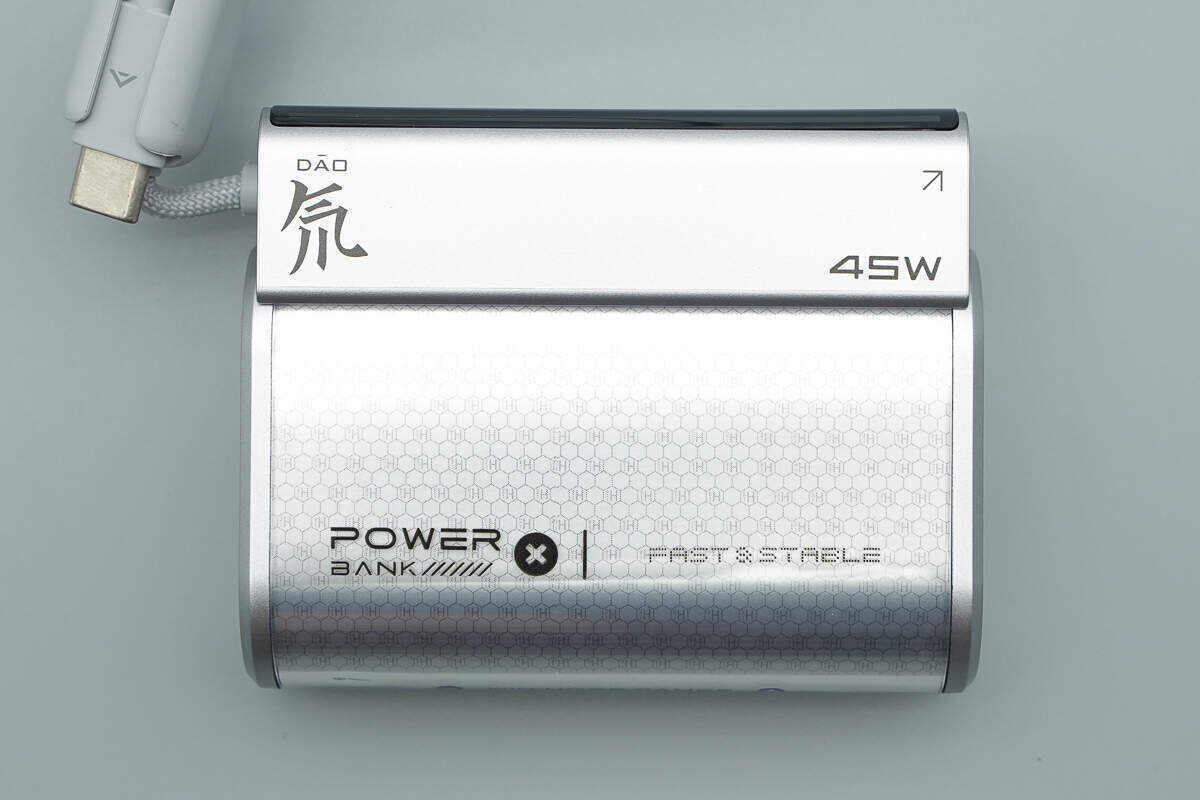 产品正面一栏,上沿盖板印有“DAO 氘”与“45W”字样,右上角方向箭头强调插接方向。下面主体大面积采用细密蜂巢纹理,配合“POWER BANK / FAST & STABLE”字样,形成赛博工业风的装饰面。边缘采用高光倒角处理,线条简洁,金属光泽均匀,整机显得非常精致。