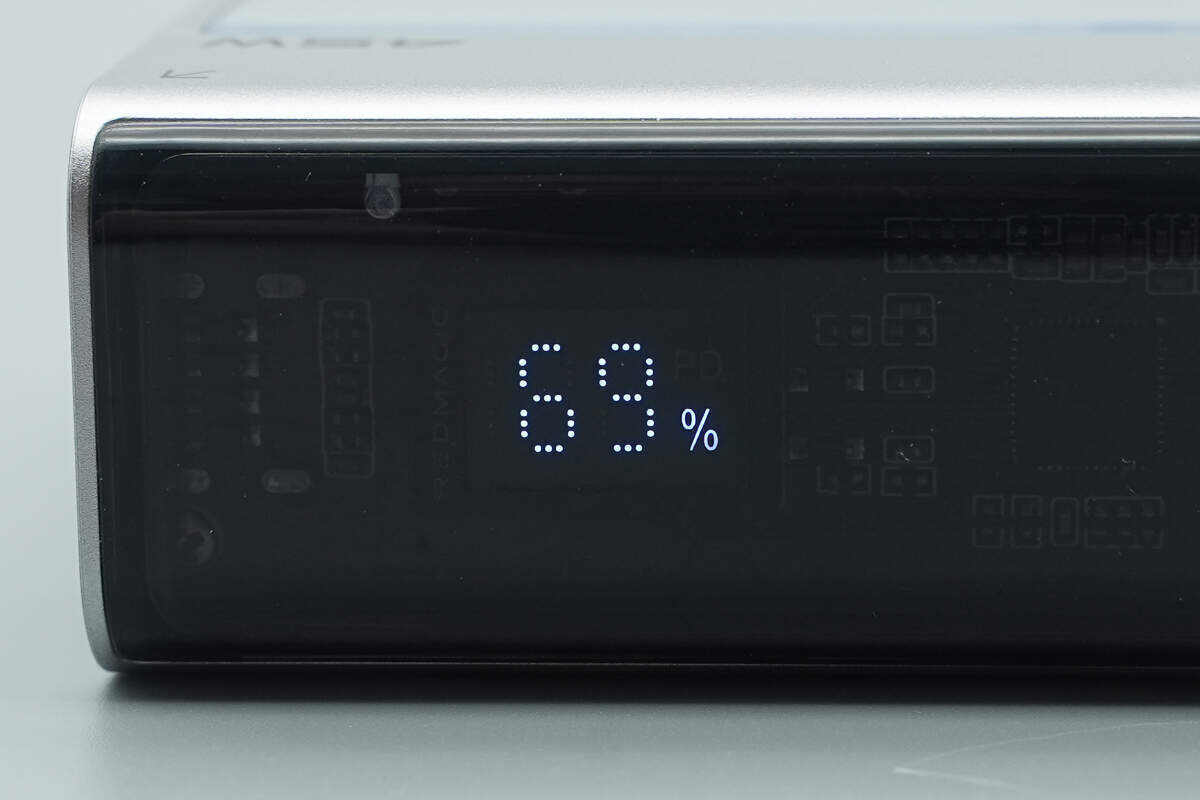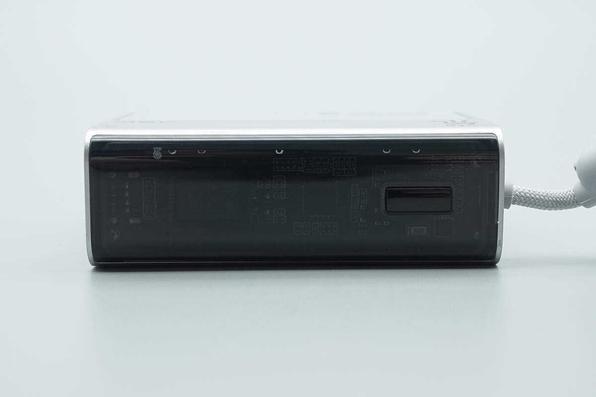 另一侧为整块熏黑透明面板,可以透过这块透明面板看到充电宝内部电路,右边面板开孔嵌有长条形按键。