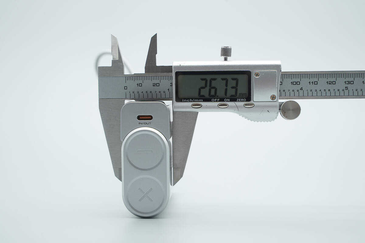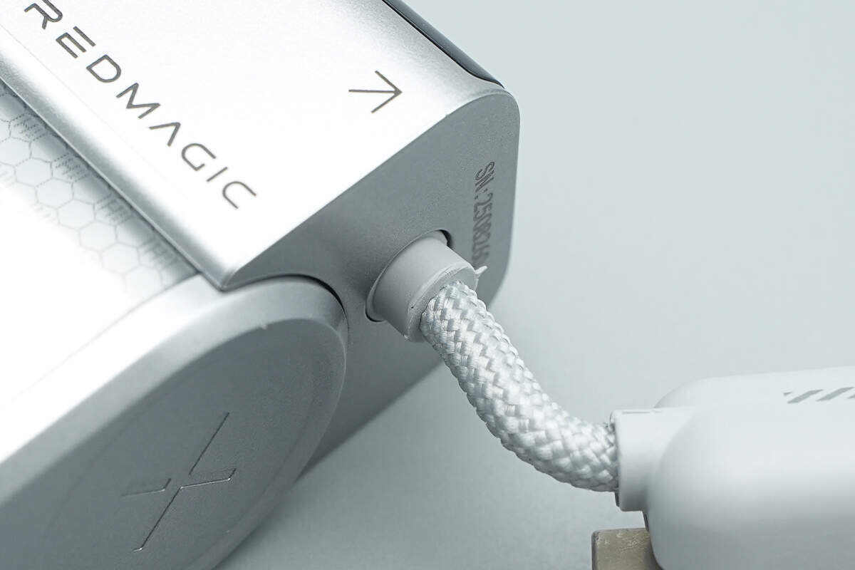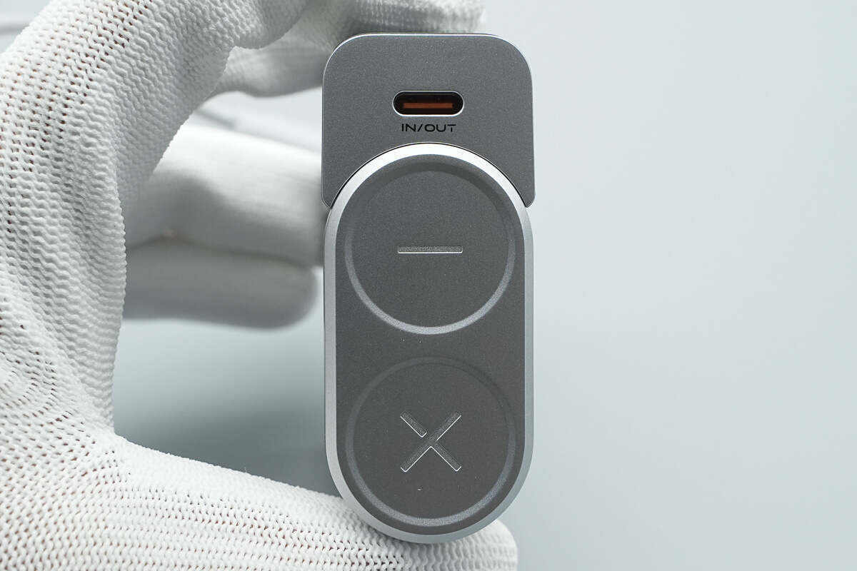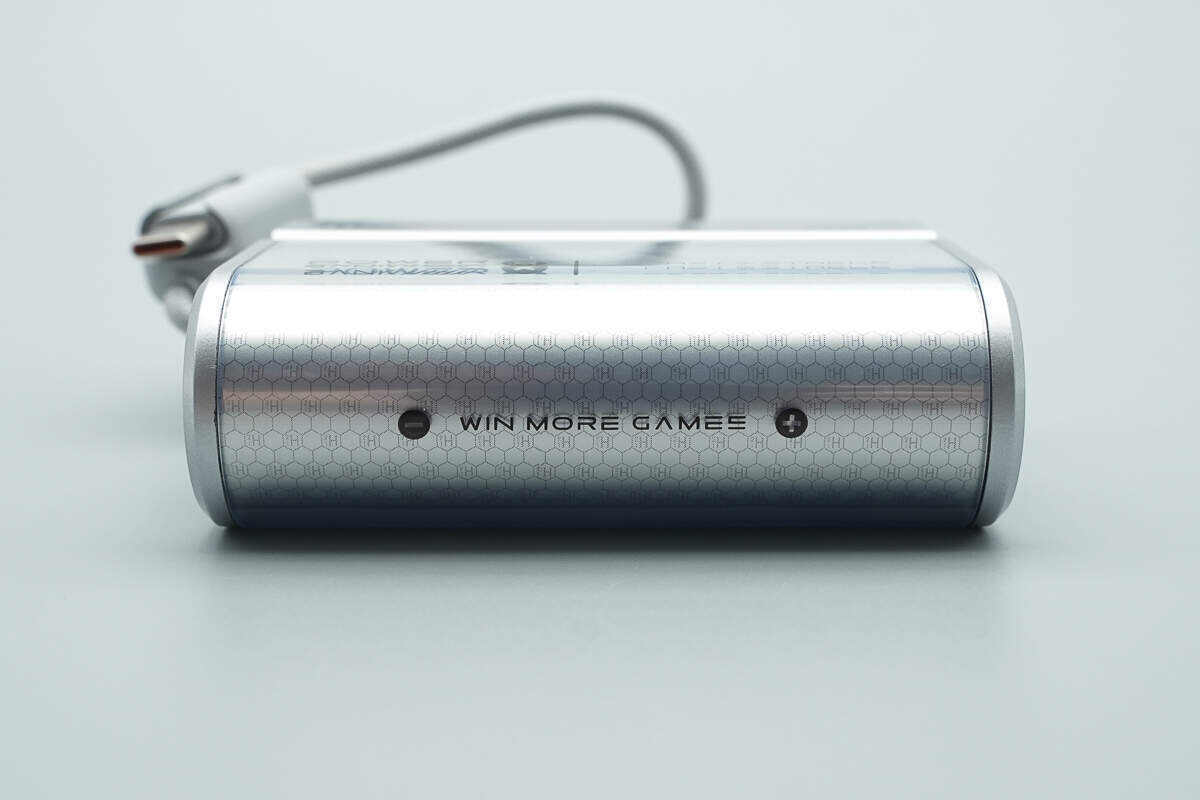 充电宝延续了红魔氘锋系列设计语言,通体为银灰配色,一体式金属外壳搭配大圆角,侧面呈圆柱过渡,握持感顺滑,这次还升级了自带提拉线,带卡扣座可固定插头,可当手绳也方便随手取用。