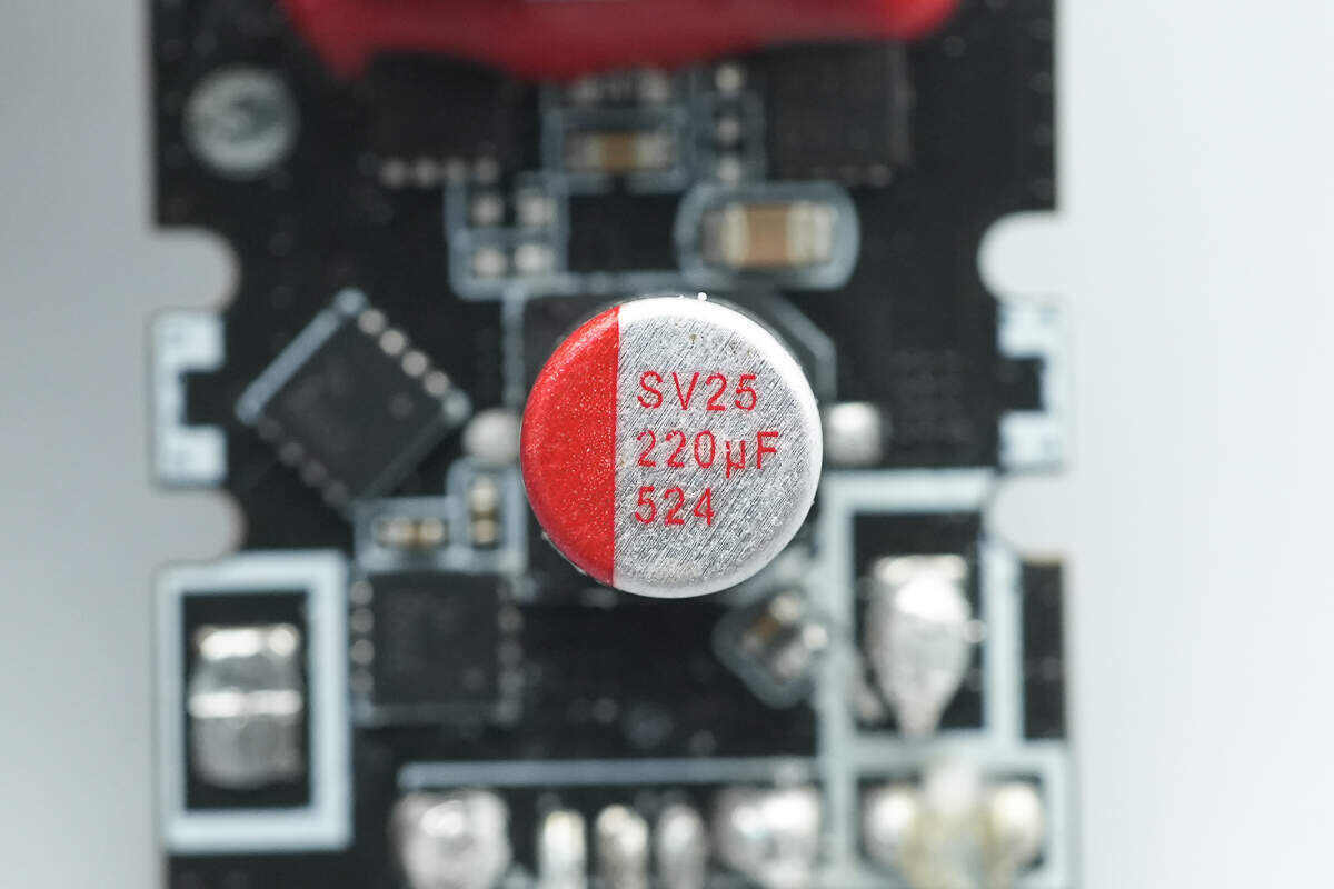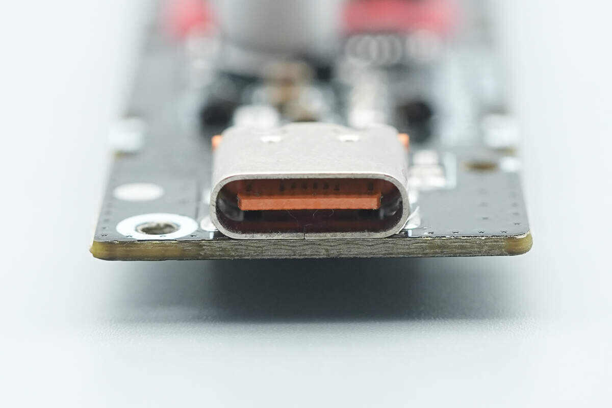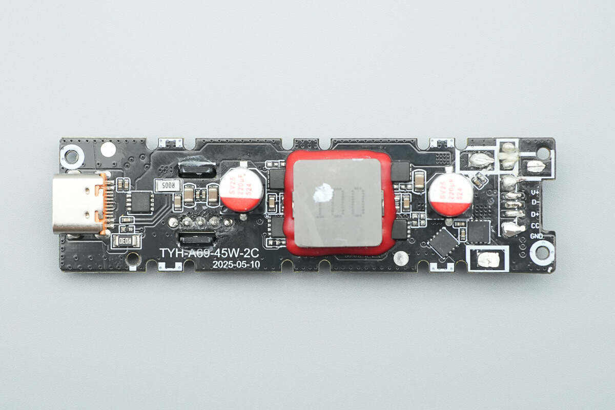 背面设有VBUS开关管、同步升降压开关管、电感、滤波固态电容、电池保护管等器件,并焊接USB-C接口。