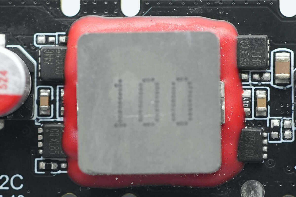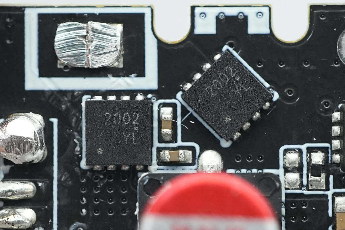 升降压电感打胶加固,两侧设有四颗同步升降压开关管,料号全部一样。
