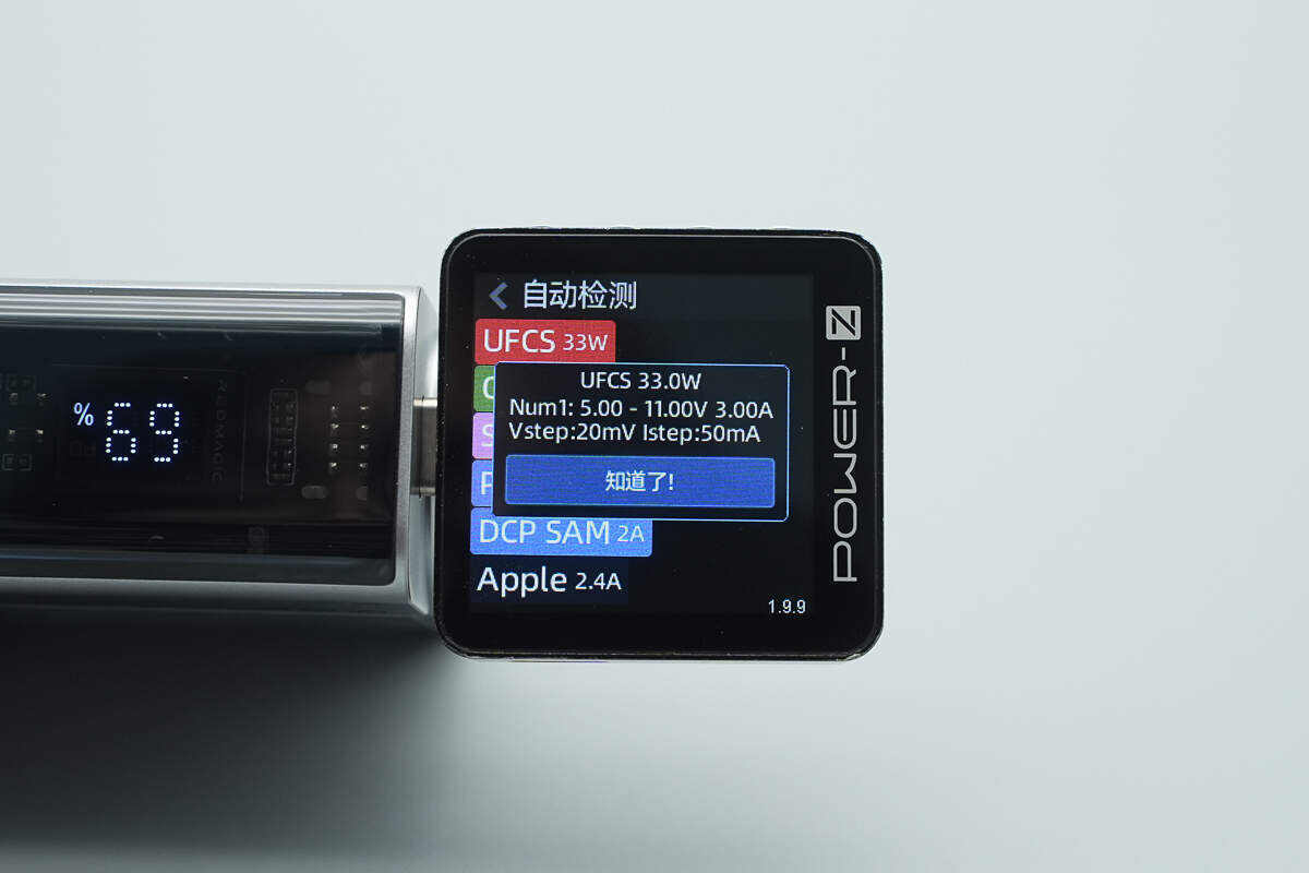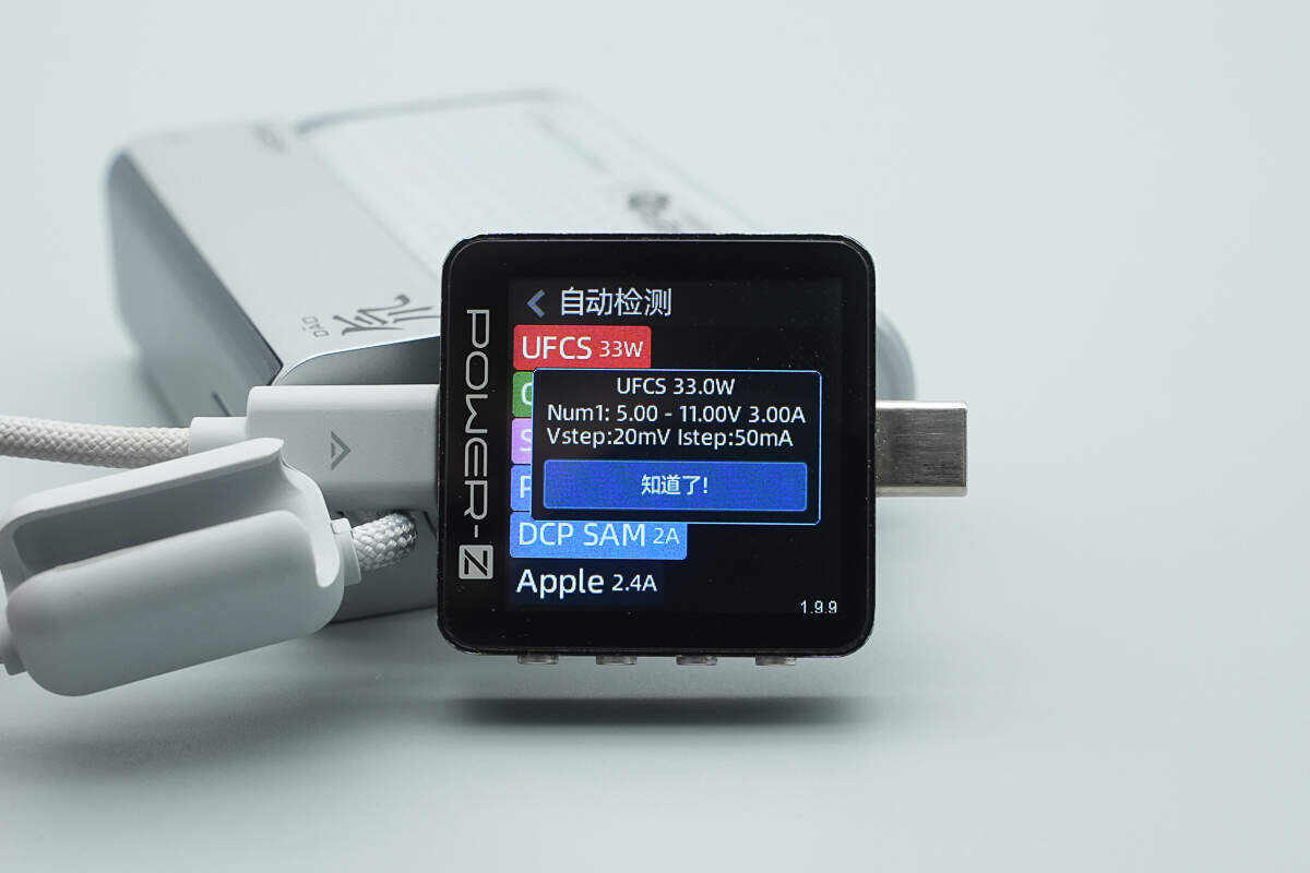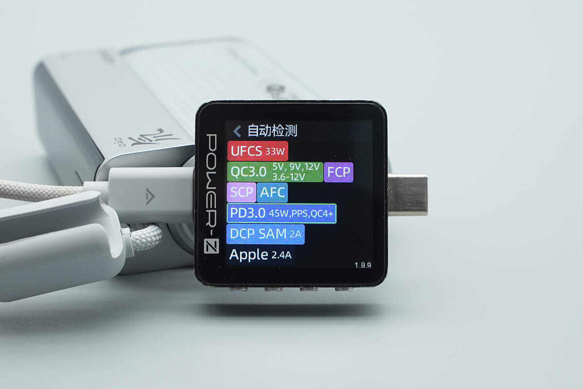 接入ChargerLAB POWER-Z KM003C,测得USB-C自带线支持UFCS、QC4+/3.0、FCP、SCP、AFC、PD3.0、PPS、DCP SAM以及Apple 2.4A快充协议。