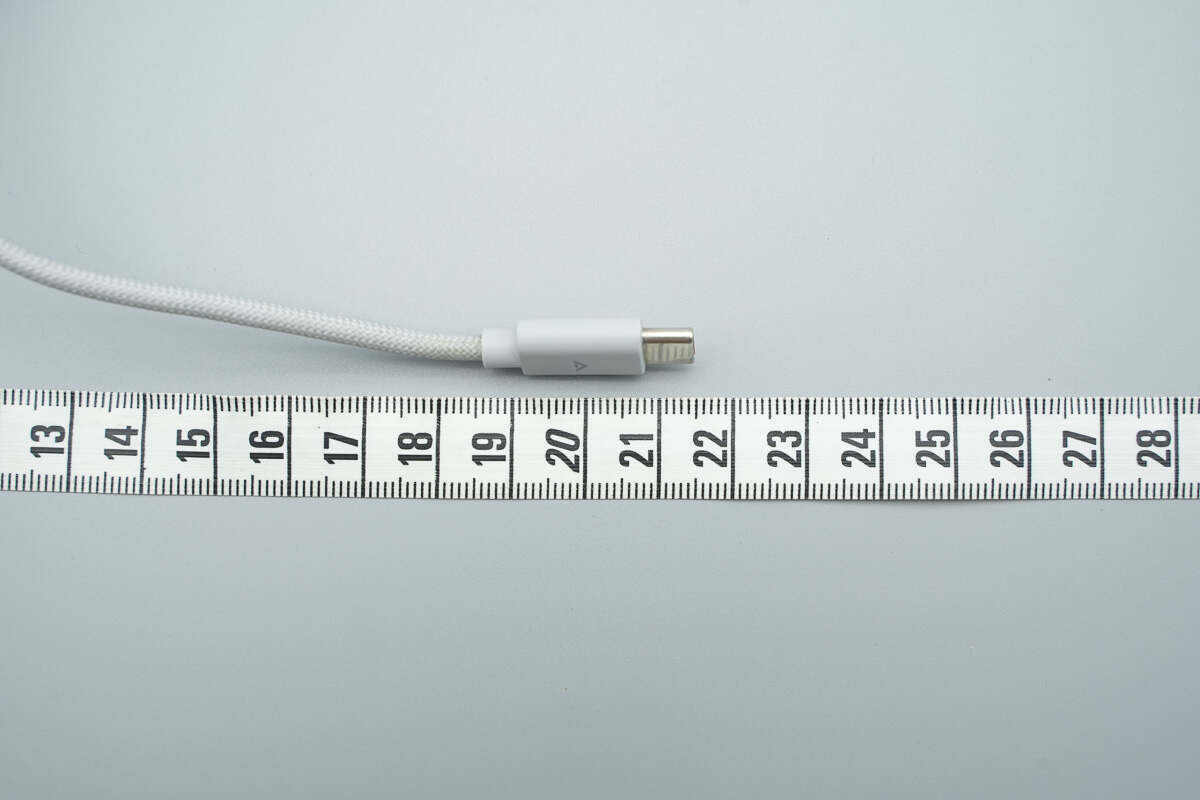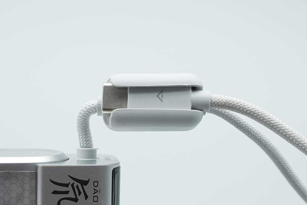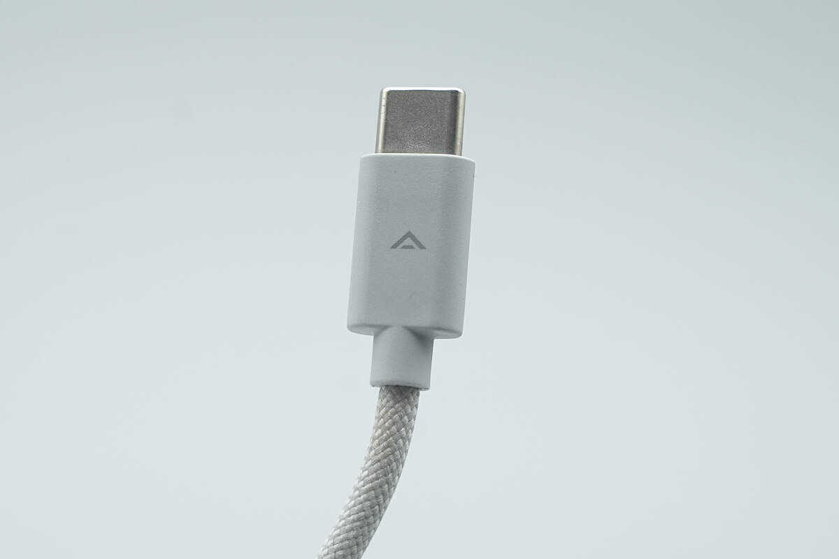 USB-C 插头为磨砂灰色外壳,尾部短款应力消除设计衔接编织线,插头边角顺直、做工细致。