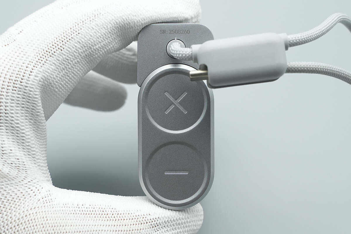 端面为一体金属盖板,双圆形凹槽做出“X / —”浮雕符号,边缘倒角细腻;编织USB-C短线从加固护套处引出。