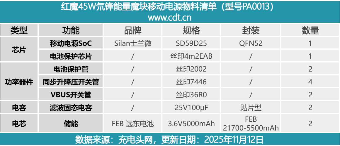 最后附上红魔氘锋能量魔块移动电源的核心器件清单,方便大家查阅。