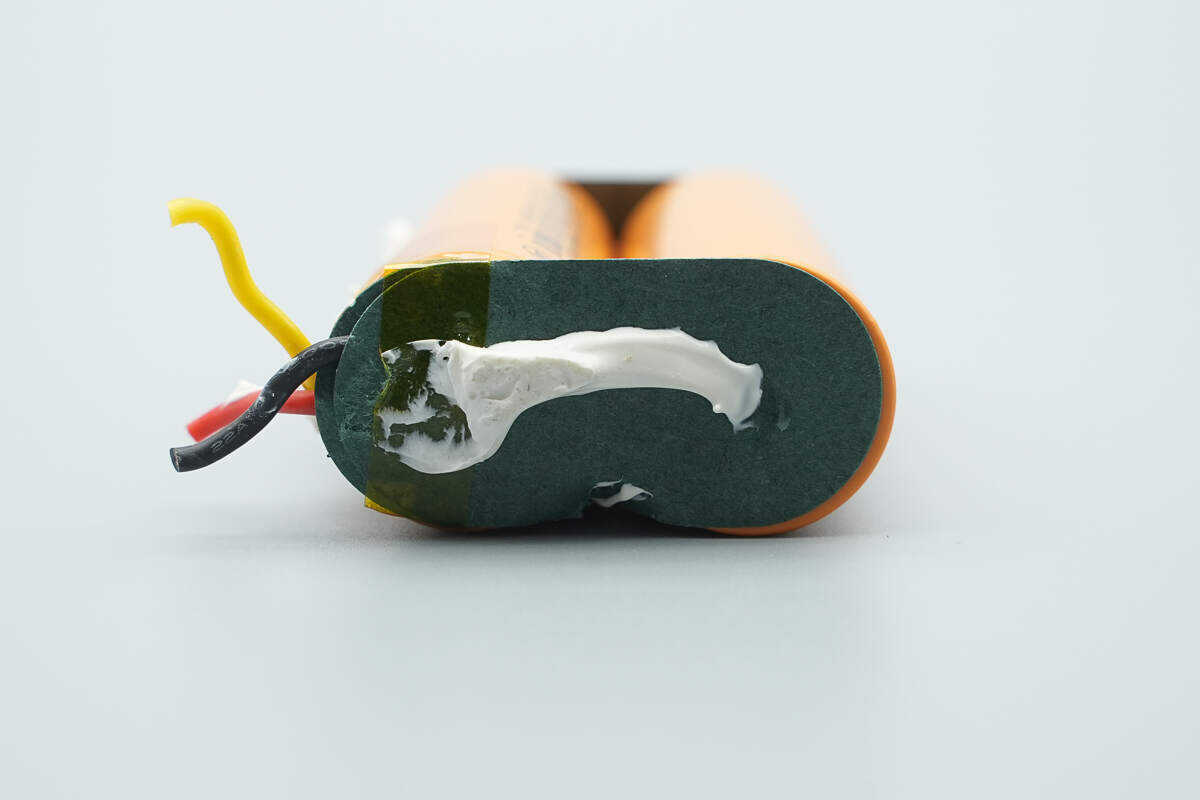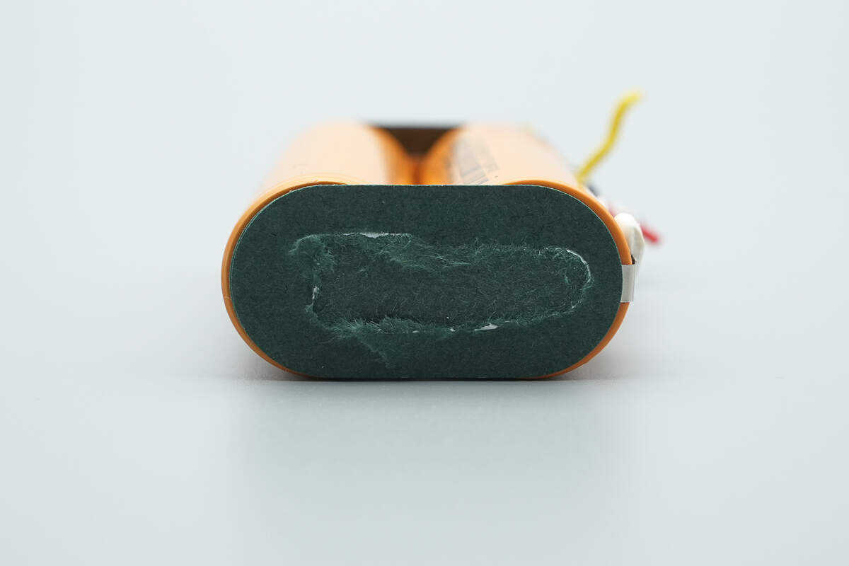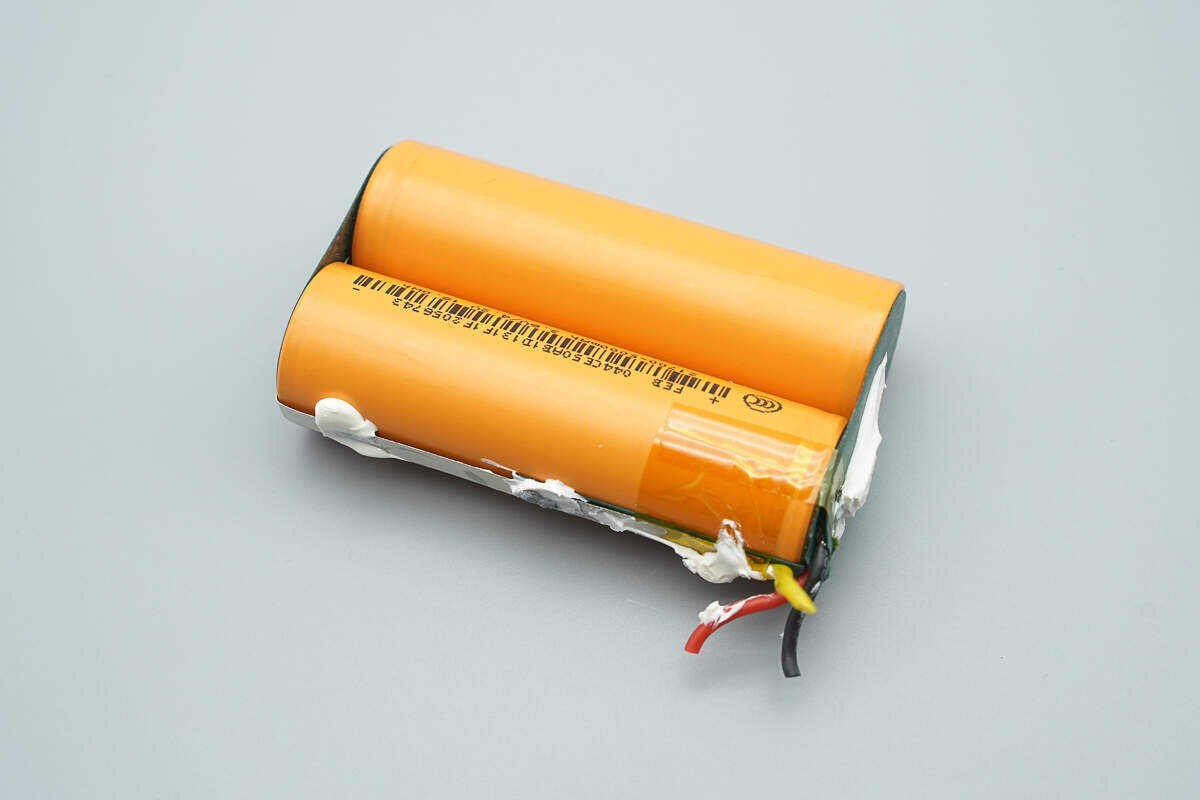 电池组整体结构一览,可见由两枚橙色圆柱锂电芯串联而成,端面贴有绝缘垫片,电芯与托板之间可见白色灌胶与泡棉做固定与防震。