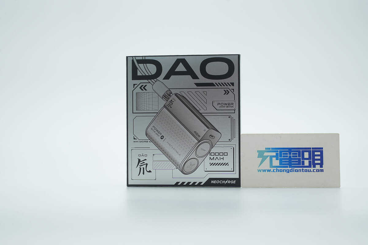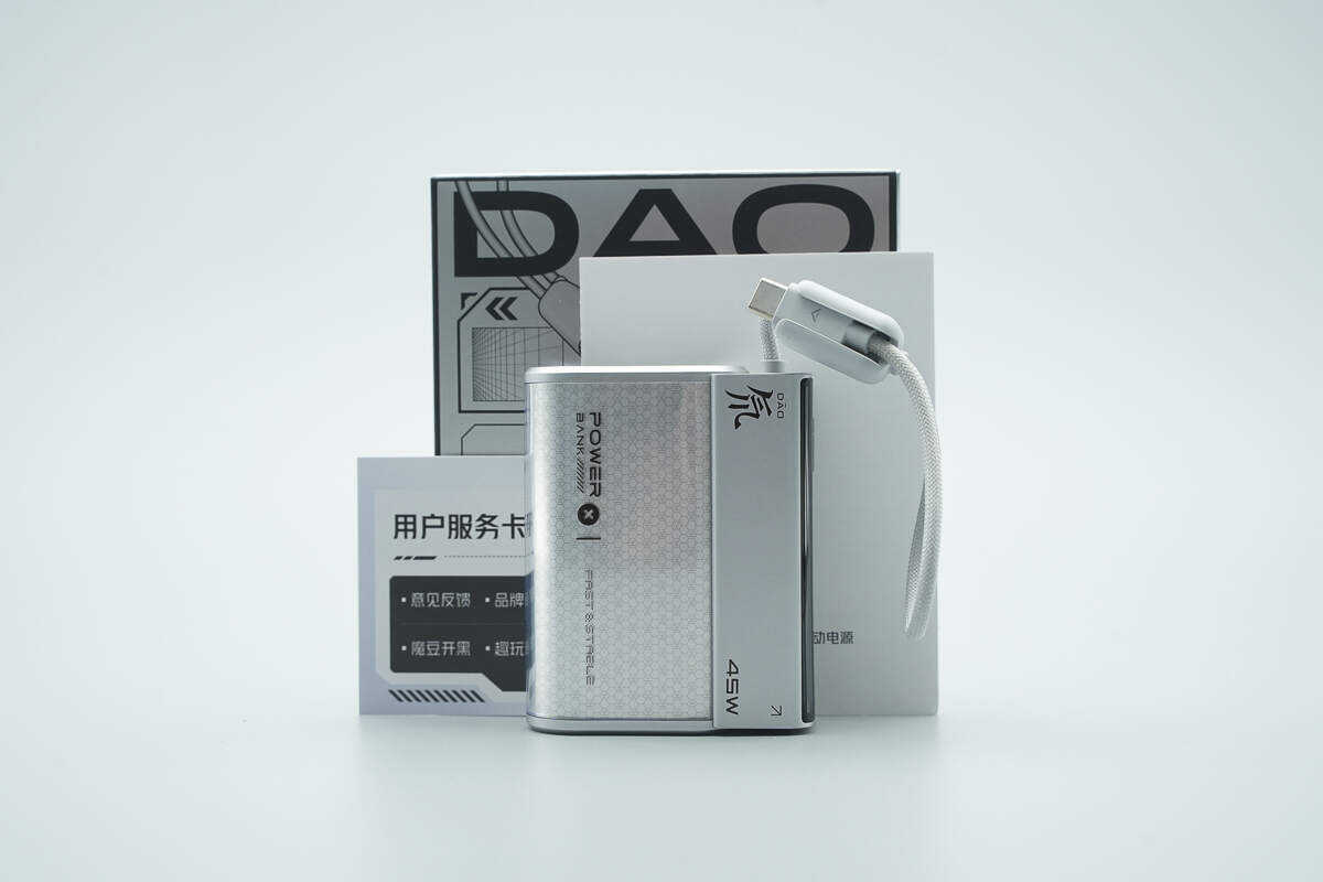 红魔45W氘锋移动电源包装盒延续氘锋系列银色基调设计,正面印有DAO氘标识以及产品效果图。