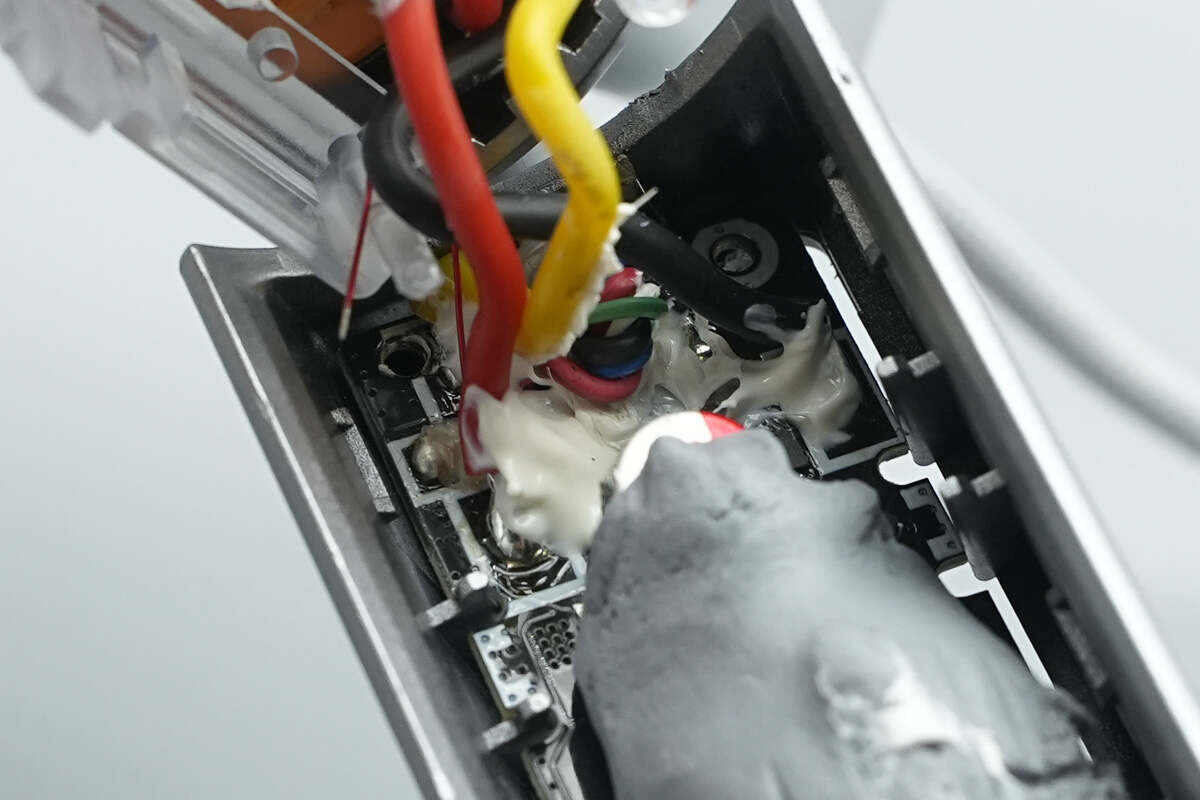 接下来将电池组和PCB模块分开,两者之间通过卡扣拼接固定。电池组外套塑料壳进行隔离保护,周围点胶与泡棉固定防震,侧面覆有导热硅胶以贴合外壳。右侧为PCB模块主控电路,整块小板固定在金属腔体内并覆盖灰色导热灌封胶。