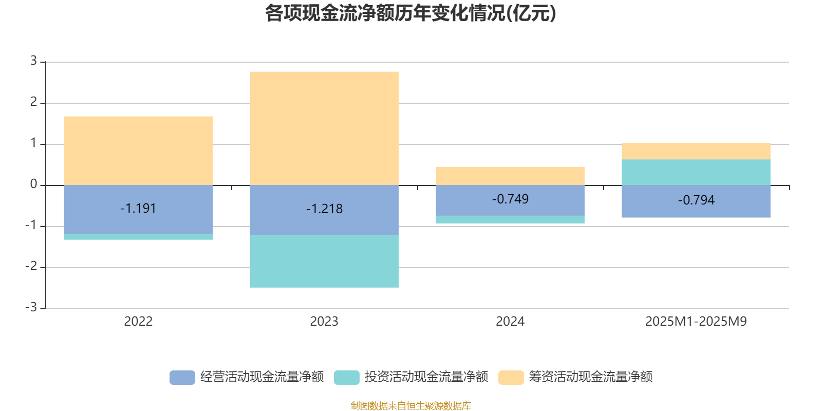 2025年1月至9月,公司经营活动现金流净额为-7944.1万元,同比减少2443.4万元;筹资活动现金流净额4024.2万元,同比增加388.5万元;投资活动现金流净额6226万元,上年同期为-4584.9万元。