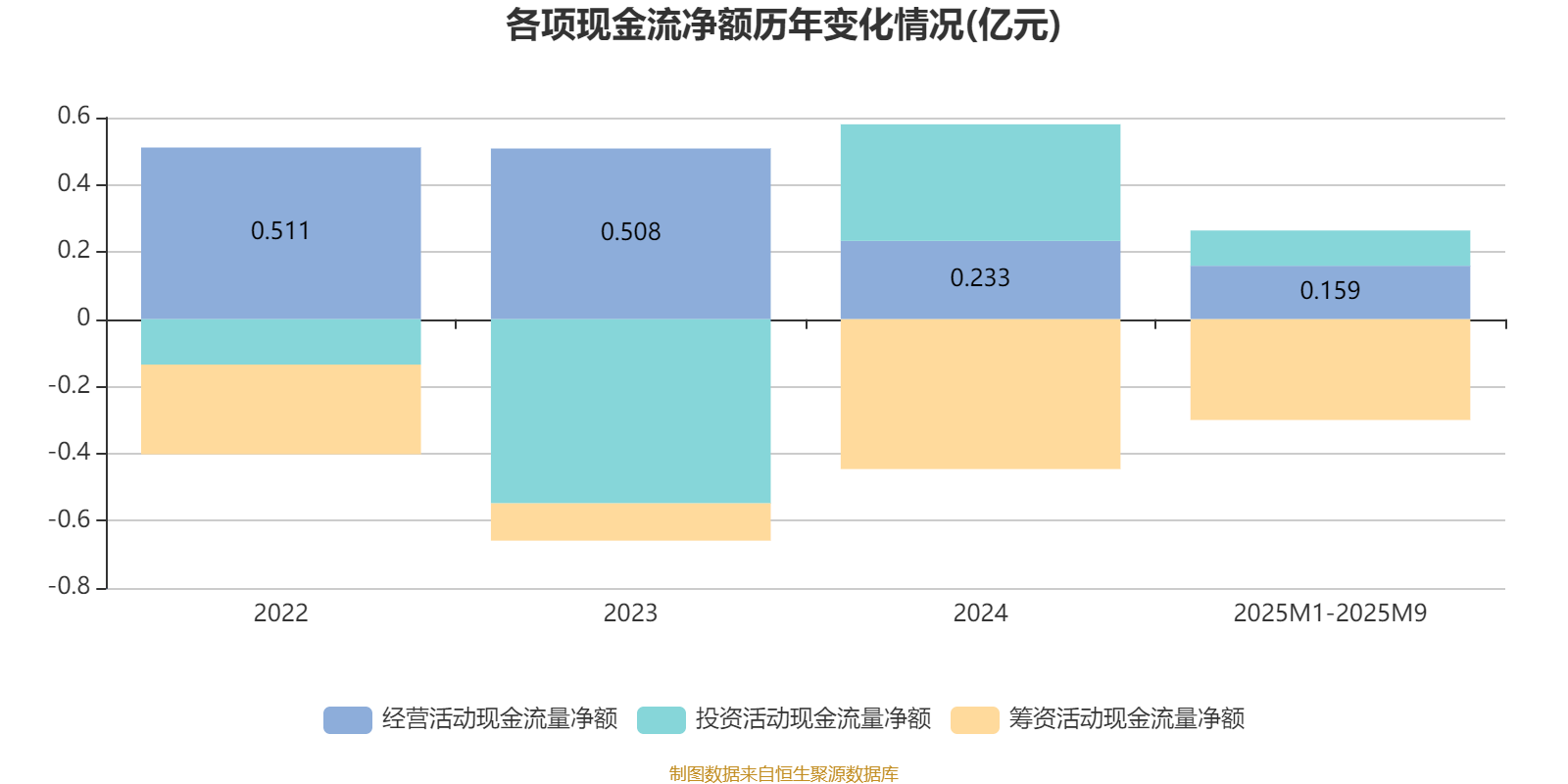 2025年1月至9月,公司经营活动现金流净额为1592.3万元,同比增长1.1%;筹资活动现金流净额-2998.5万元,同比增加1191.6万元;投资活动现金流净额1051.9万元,上年同期为2530.9万元。