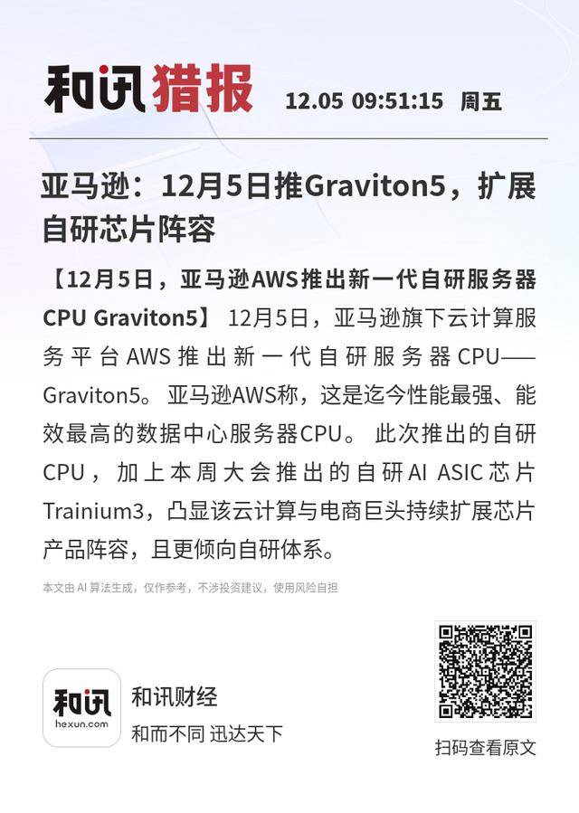 【12月5日,亚马逊AWS推出新一代自研服务器CPUGraviton5】12月5日,亚马逊旗下云计算服务平台AWS推出新一代自研服务器CPU——Graviton5。 亚马逊AWS称,这是迄今性能最强、能效最高的数据中心服务器CPU。 此次推出的自研CPU,加上本周大会推出的自研AI ASIC芯片TrAInium3,凸显该云计算与电商巨头持续扩展芯片产品阵容,且更倾向自研体系。