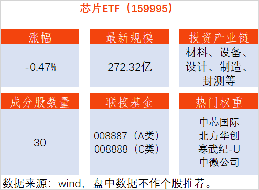 资料显示,芯片ETF(159995)跟踪国证芯片指数,30只成分股集合A股芯片产业中材料、设备、设计、制造、封装和测试等龙头企业,其中包括中芯国际、寒武纪、长电科技、北方华创等。其场外联接基金为,A类:008887;C类:008888。