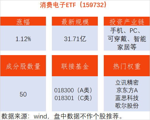 消费电子ETF(159732)跟踪国证消费电子指数,主要投资于业务涉及消费电子产业的50家A股上市公司,行业主要分布于电子制造、半导体、光学光电子等市场关注度较高的主流板块。其场外联接基金为,A类:018300;C类:018301。