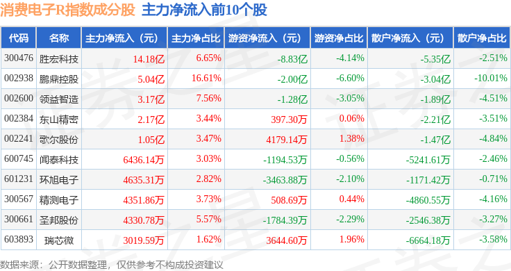 资金流向方面,消费电子R(480030)指数成份股当日主力资金净流出合计7.73亿元,游资资金净流出合计2.2亿元,散户资金净流入合计9.93亿元。成份股资金流向详情见下表: