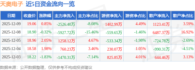 证券之星消息,截至2025年12月9日收盘,天奥电子(002935)报收于19.06元,上涨0.85%,换手率3.94%,成交量16.37万手,成交额3.13亿元。