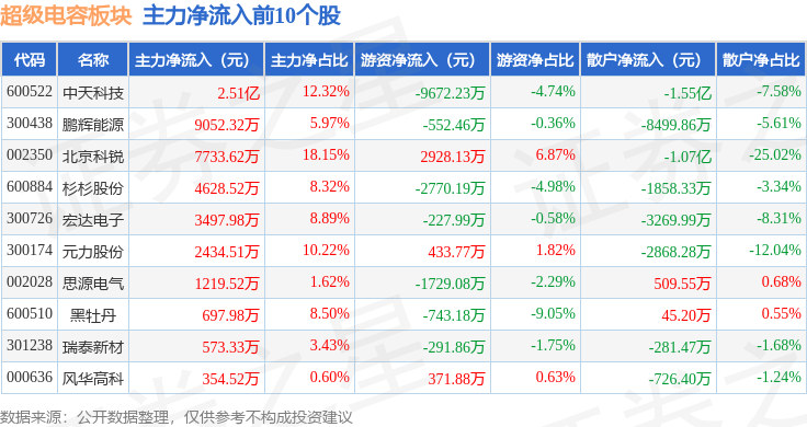 从资金流向上来看,当日超级电容板块主力资金净流出2.13亿元,游资资金净流出9216.33万元,散户资金净流入3.05亿元。超级电容板块个股资金流向见下表: