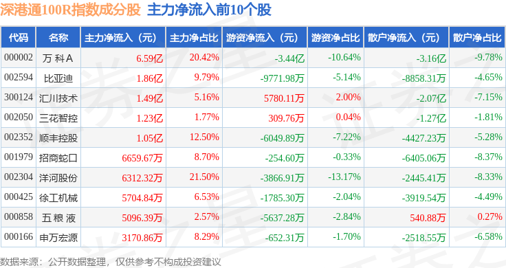 资金流向方面,深港通100R(483007)指数成份股当日主力资金净流出合计40.88亿元,游资资金净流入合计8.57亿元,散户资金净流入合计32.31亿元。成份股资金流向详情见下表: