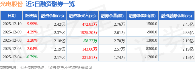 证券之星消息,截至2025年12月10日收盘,光电股份(600184)报收于21.14元,上涨9.99%,涨停,换手率9.77%,成交量49.72万手,成交额9.9亿元。