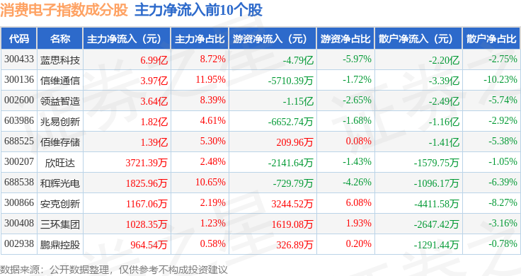 资金流向方面,消费电子(980030)指数成份股当日主力资金净流出合计22.25亿元,游资资金净流入合计4.71亿元,散户资金净流入合计17.54亿元。成份股资金流向详情见下表: