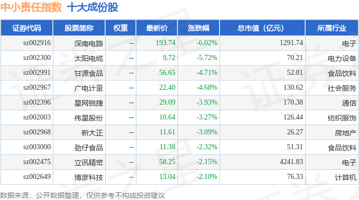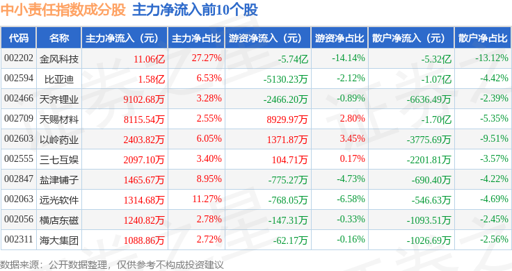 资金流向方面,中小责任(399651)指数成份股当日主力资金净流出合计11.36亿元,游资资金净流出合计2572.49万元,散户资金净流入合计11.62亿元。成份股资金流向详情见下表: