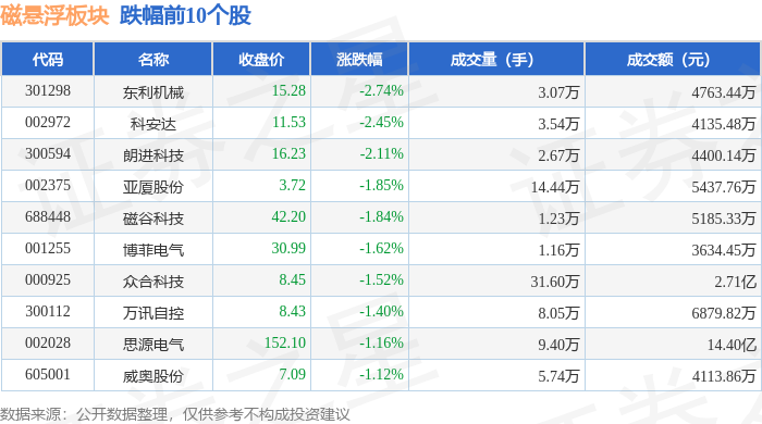 从资金流向上来看,当日磁悬浮板块主力资金净流出5926.14万元,游资资金净流入1.9亿元,散户资金净流出1.31亿元。磁悬浮板块个股资金流向见下表: