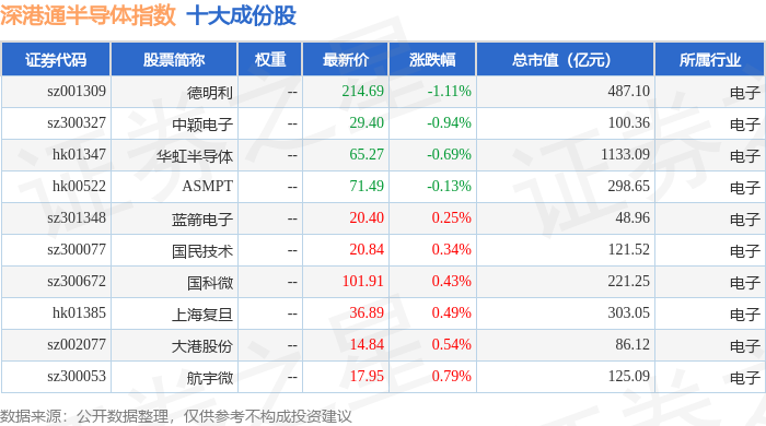 证券之星消息,12月12日,深港通半导体(983067)指数报收于14124.99点,涨1.91%,成交457.67亿元,换手率3.49%。当日该指数成份股中,上涨的有35家,赛微电子以11.52%的涨幅领涨,下跌的有4家,德明利以1.11%的跌幅领跌。
