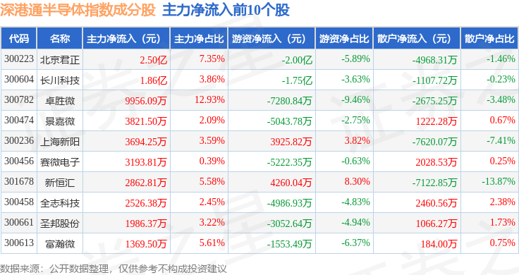 资金流向方面,深港通半导体(983067)指数成份股当日主力资金净流入合计1.29亿元,游资资金净流出合计7.08亿元,散户资金净流入合计5.79亿元。成份股资金流向详情见下表: