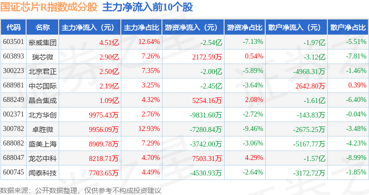 资金流向方面,国证芯片R(480017)指数成份股当日主力资金净流出合计7.4亿元,游资资金净流入合计3.5亿元,散户资金净流入合计3.91亿元。成份股资金流向详情见下表: