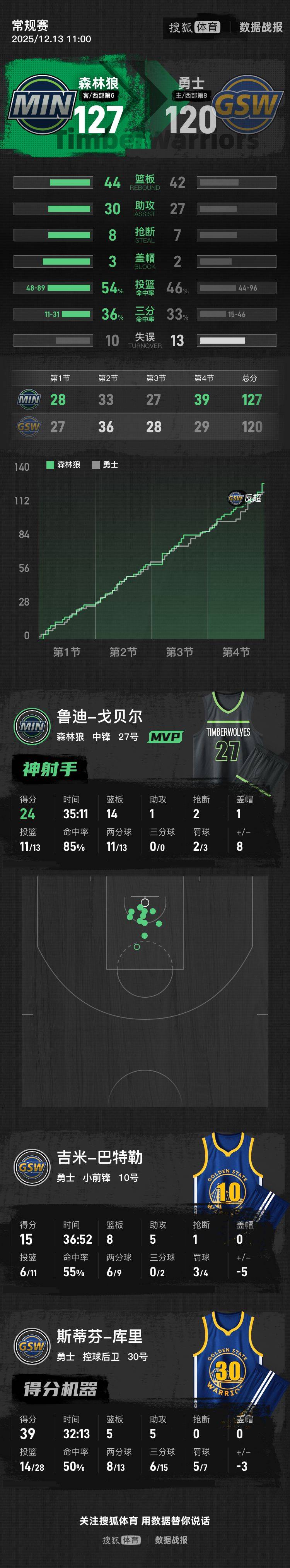 【搜狐体育战报】北京时间12月13日,2025-26赛季NBA常规赛继续进行,金州勇士主场迎战明尼苏达森林狼。全场打完,勇士120-127憾负森林狼。